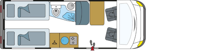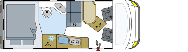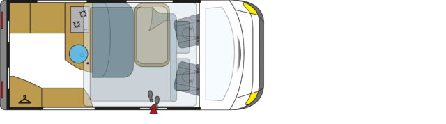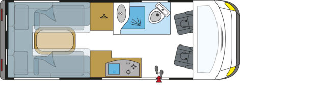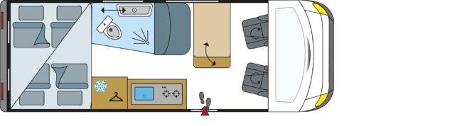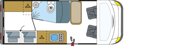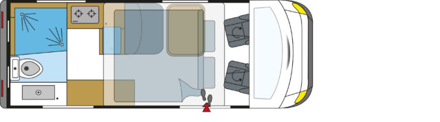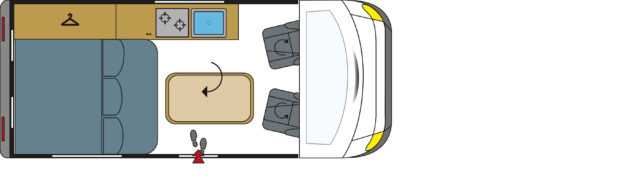 Ebenfalls ein Klassiker ist die durchdachte Aufteilung in drei Funktionsebenen, die viel Bewegungsfreiheit schafft: Vorne der Wohnbereich mit Seitendinette, dahinter auf einem Podest Winkelküche und Wäscheschrank, alternativ die Küchenzeile linksseitig. Grundrisstypisch ist aber das große Querbad im Heck mit integrierter oder sogar separater Dusche. Der Doppelboden darunter bietet Stauraum fürs Campingequipment. Geschlafen wird im Klappbett unter dem Hochdach.